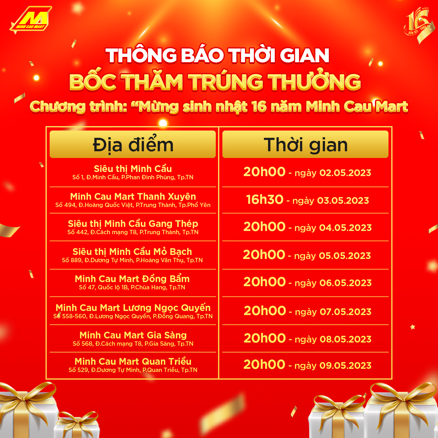 ? Minh Cau Mart gửi tới Quý khách hàng lịch BỐC THĂM TRÚNG THƯỞNG tại các điểm bán như sau: