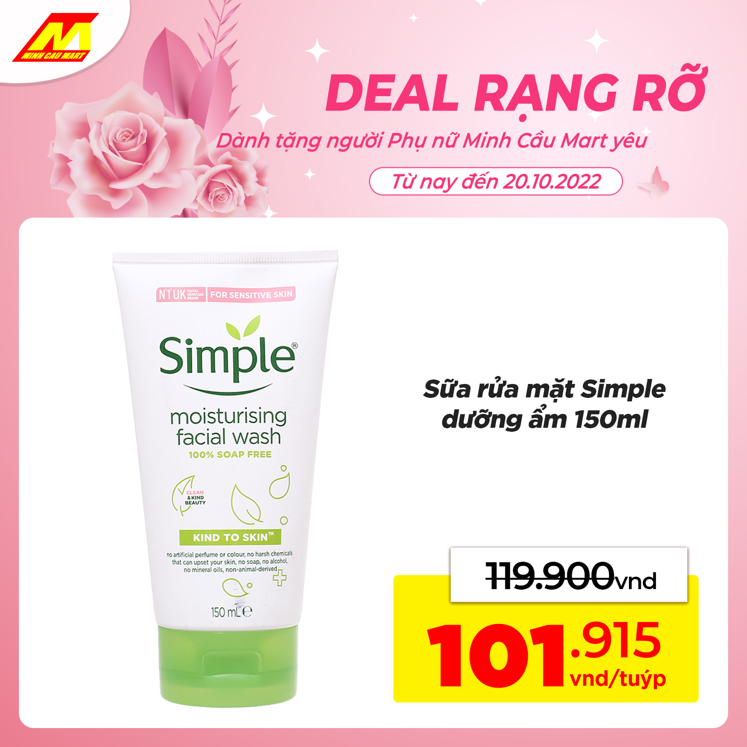 ?Sữa rửa mặt Simple dưỡng ẩm 150ml GIẢM CÒN 101.915vnd/tuýp