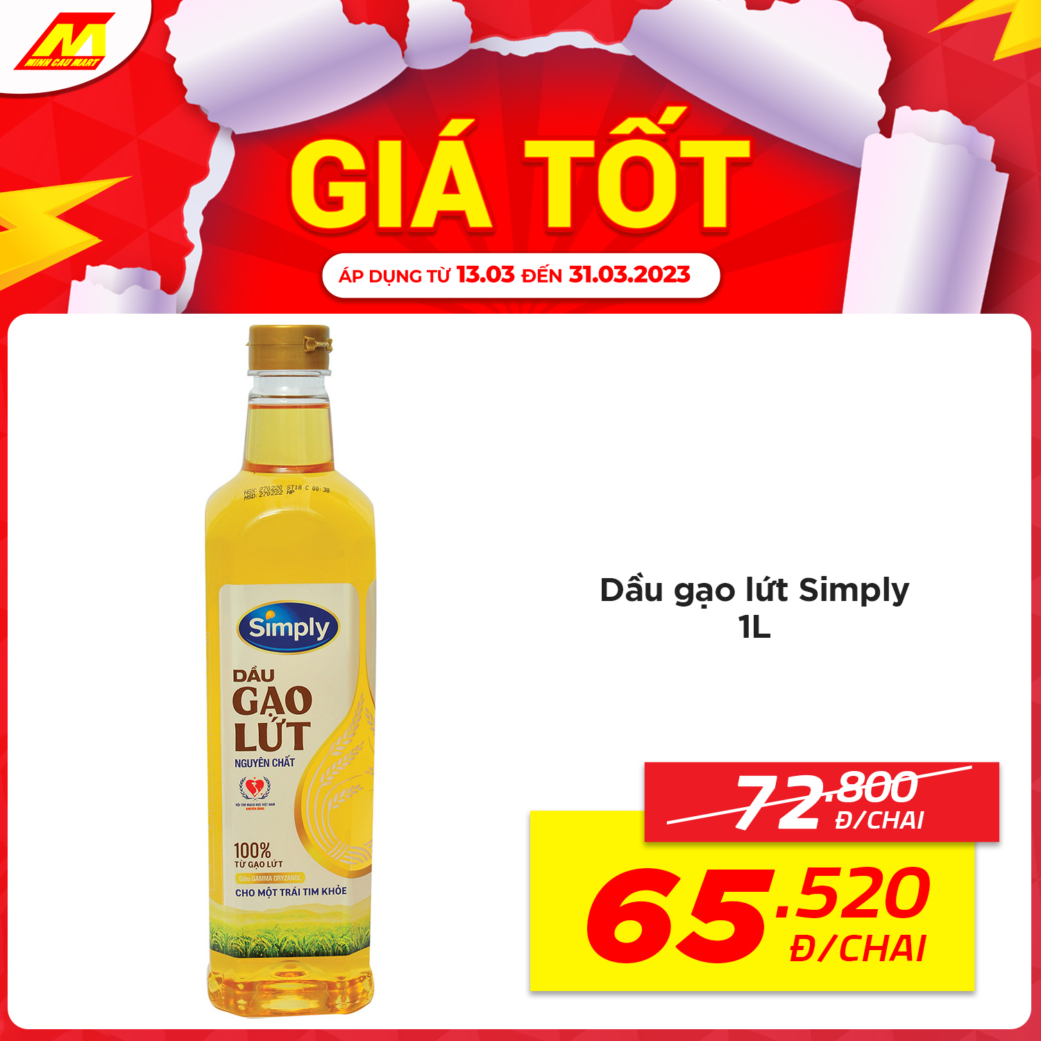 ?Dầu gạo lứt Simply 1L còn 65.520vnd/chai (Giá thường 72.800vnd)