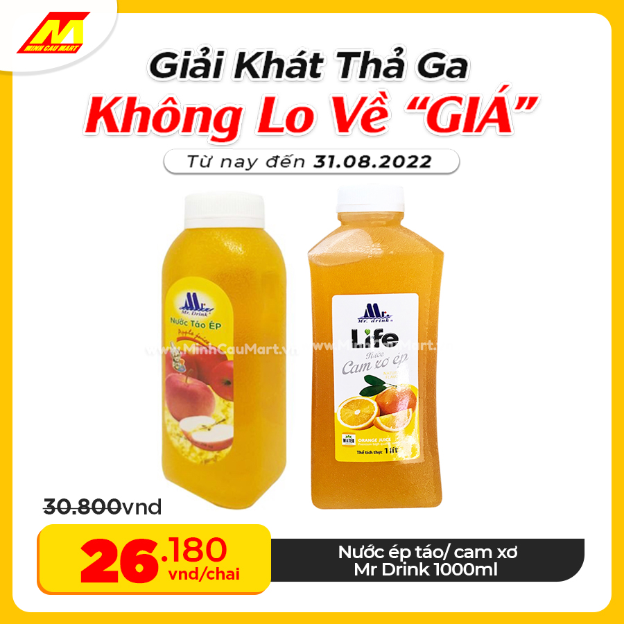?Nước ép táo/cam xơ Mr Drink 1000ml còn 26.180vnd/chai