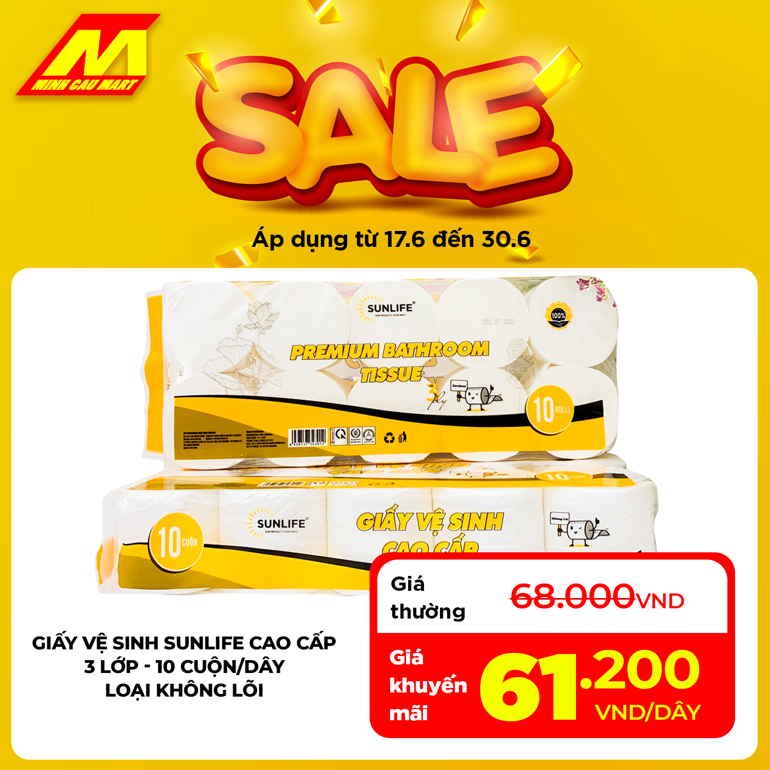 ⚡Giấy vệ sinh Sunlife cao cấp 3 lớp 10 cuộn loại không lõi GIẢM CÒN 61.200vnd/dây
