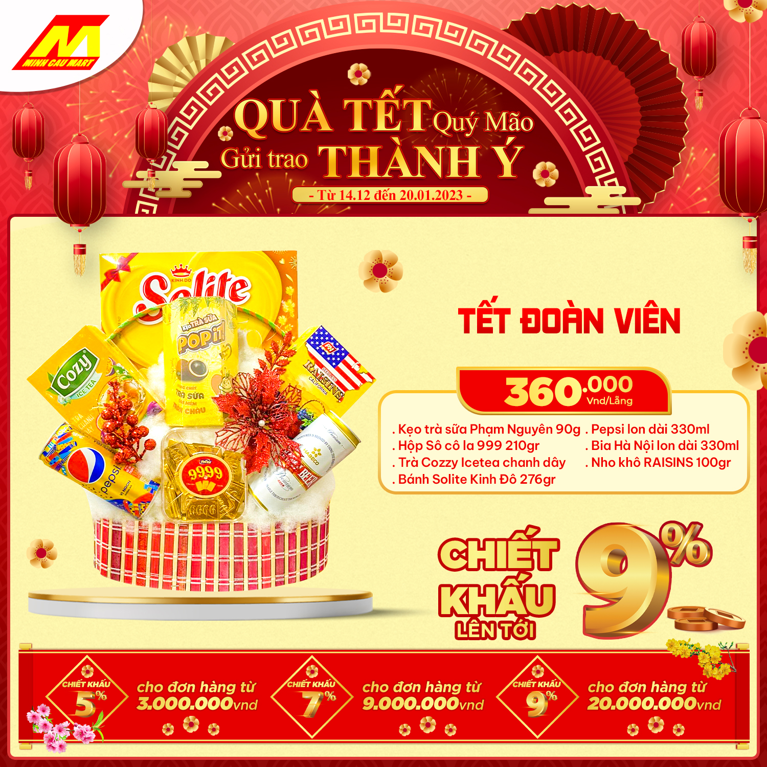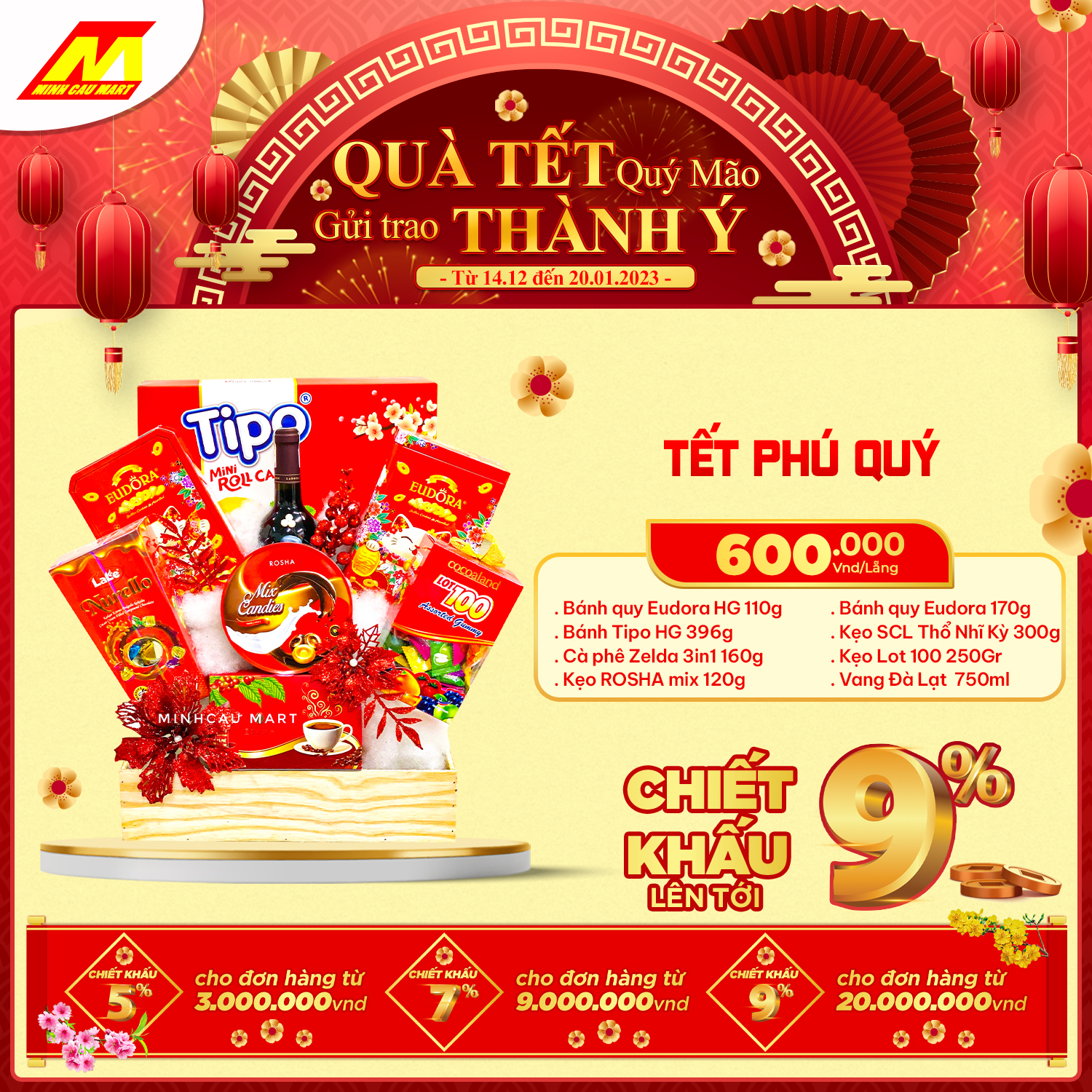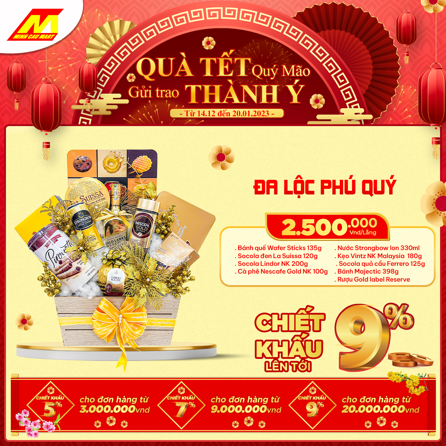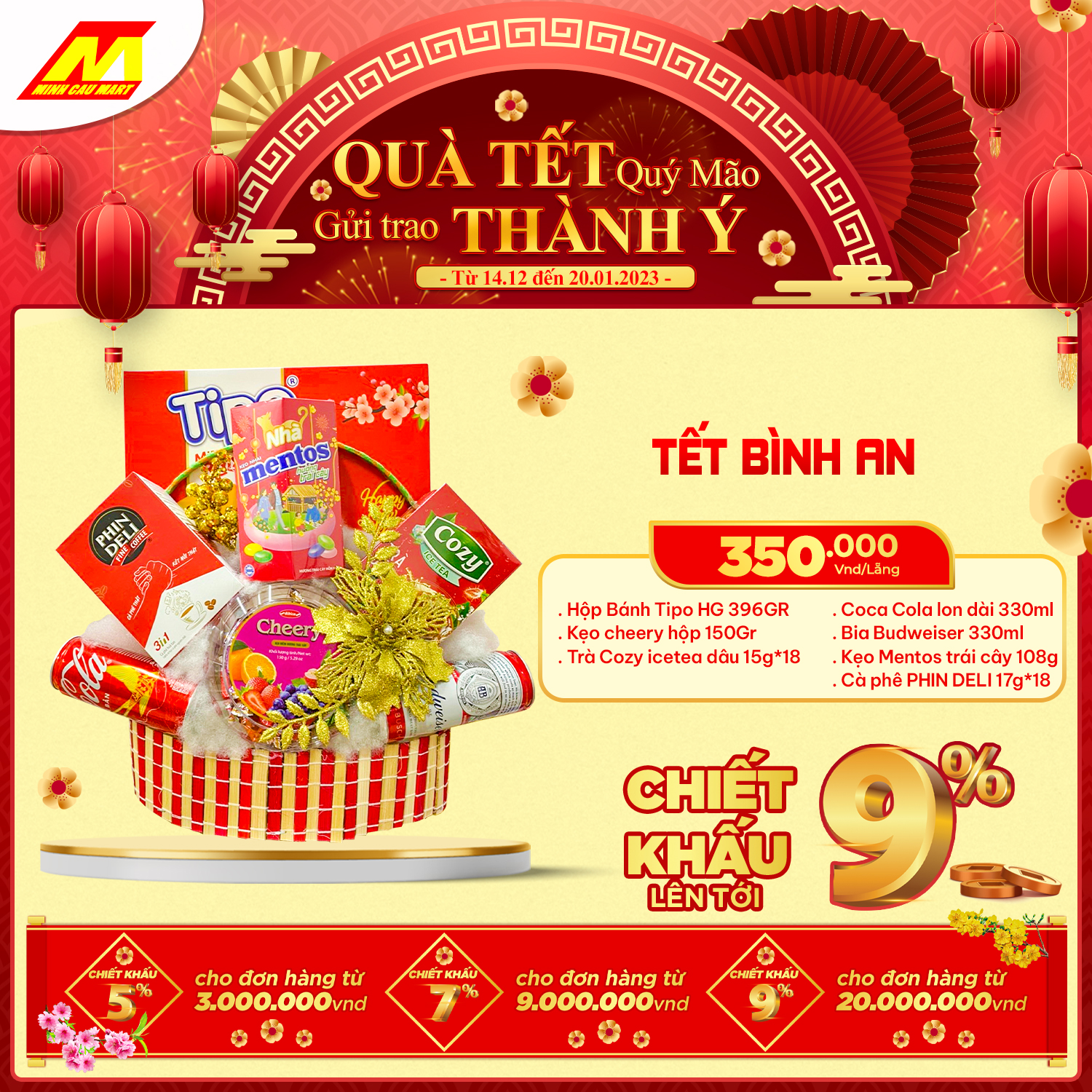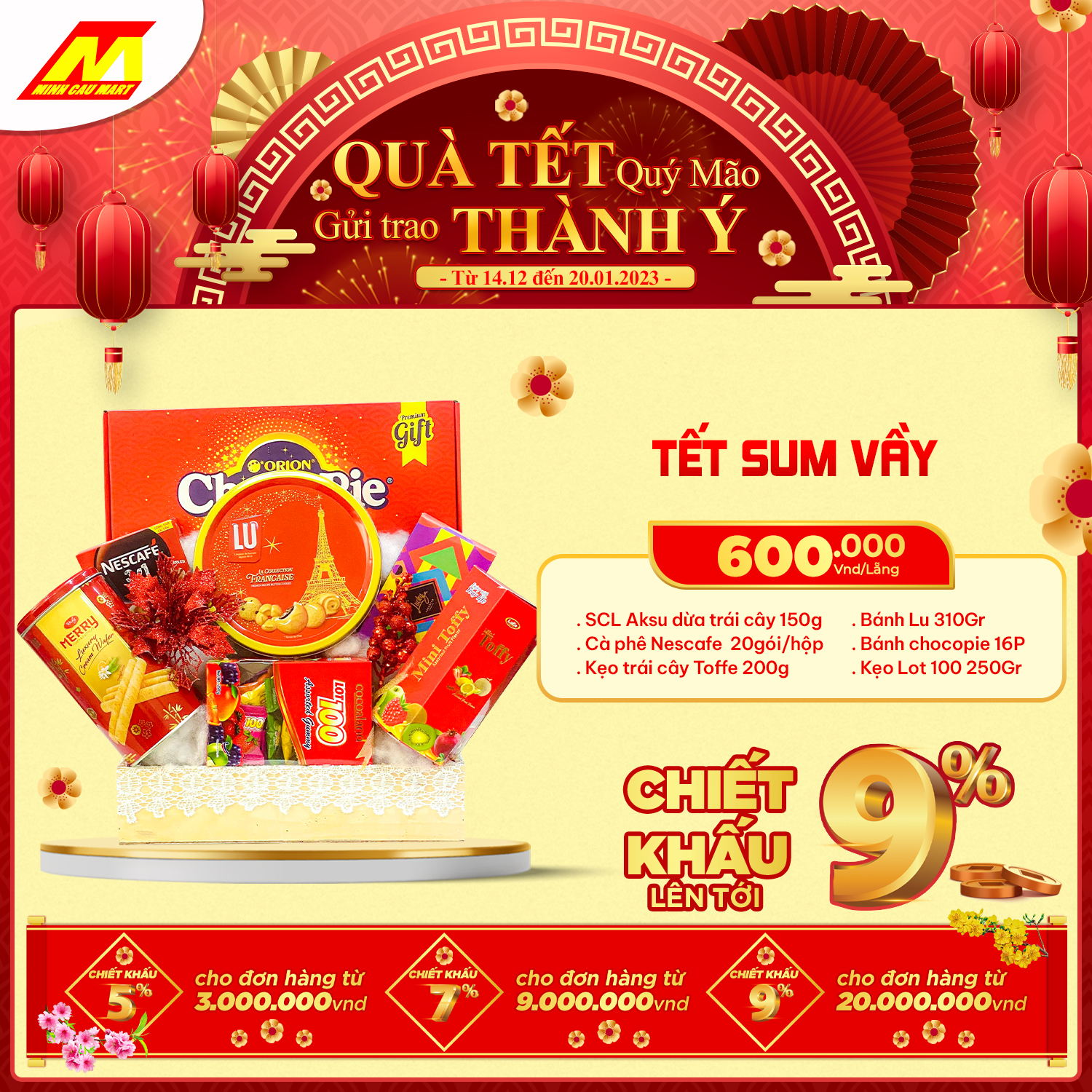 ?Cùng "Chính sách chiết khấu lên tới 9%" cho khách hàng mua số lượng lớn hoặc doanh nghiệp. Lẵng quà Minh Cầu Mart 2023 sẽ là món quà tuyệt vời GỬI TRAO THÀNH Ý đến Quý đối tác nhân mùa Tết đến xuân về này!