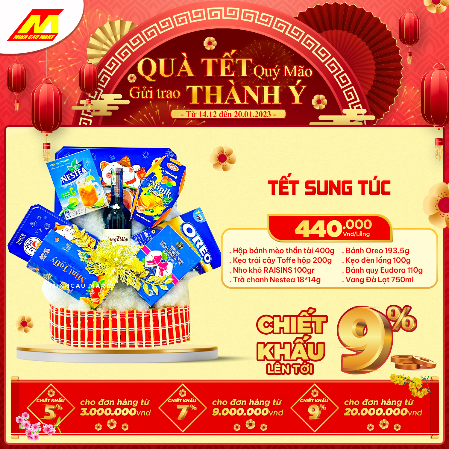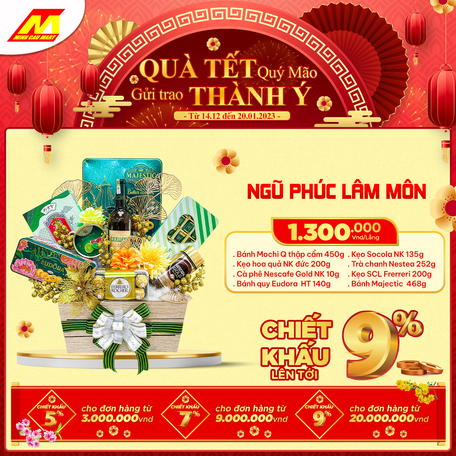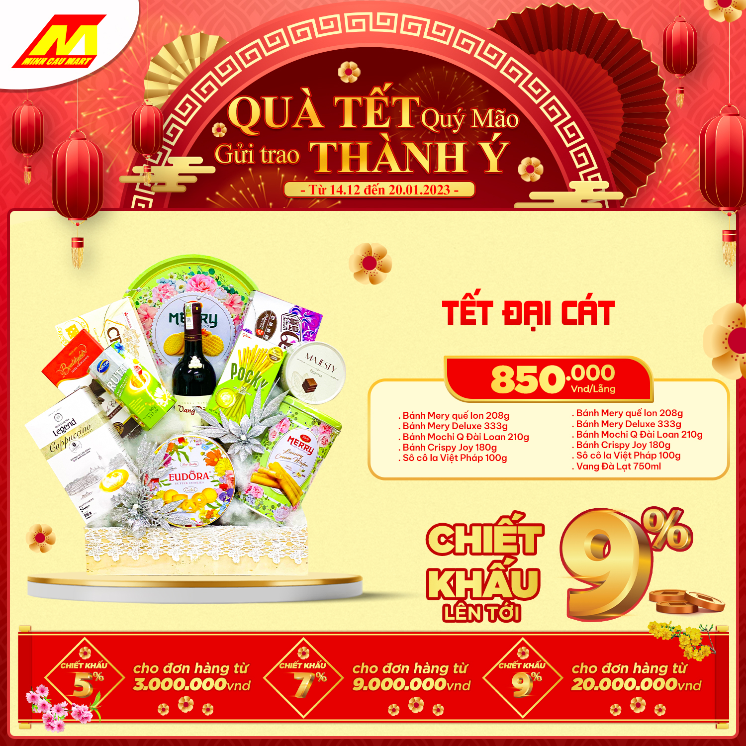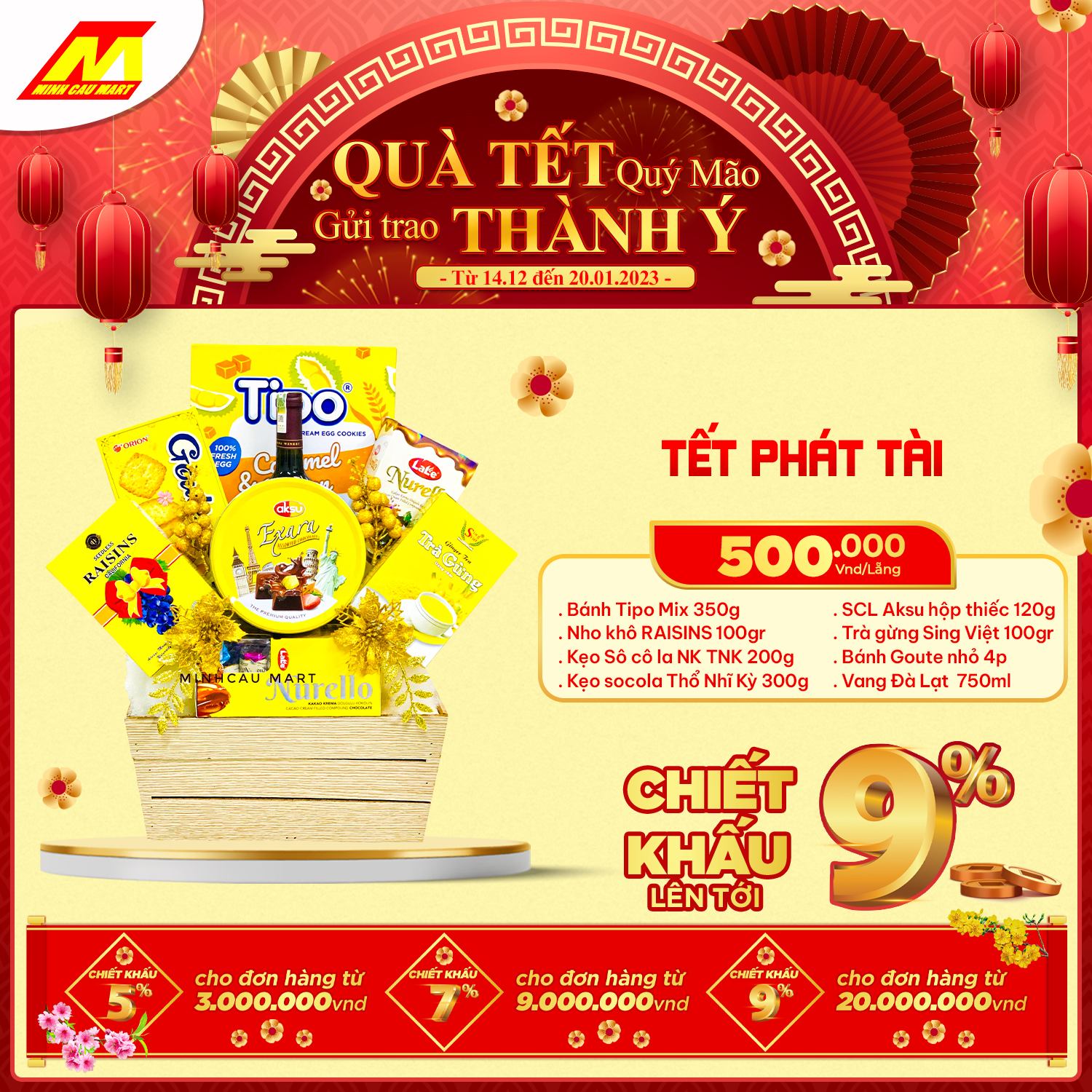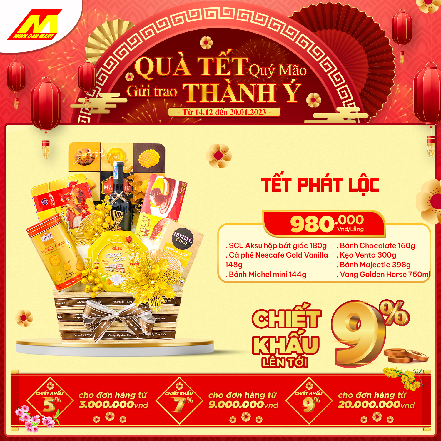 ?Cùng "Chính sách chiết khấu lên tới 9%" cho khách hàng mua số lượng lớn hoặc doanh nghiệp. Lẵng quà Minh Cầu Mart 2023 sẽ là món quà tuyệt vời GỬI TRAO THÀNH Ý đến Quý đối tác nhân mùa Tết đến xuân về này!