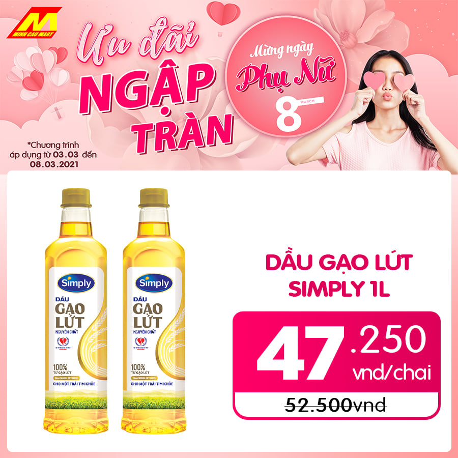 ☀ Dầu gạo lứt Simply 1L chỉ còn 47.250vnd/chai (giá gốc 52.500đ)