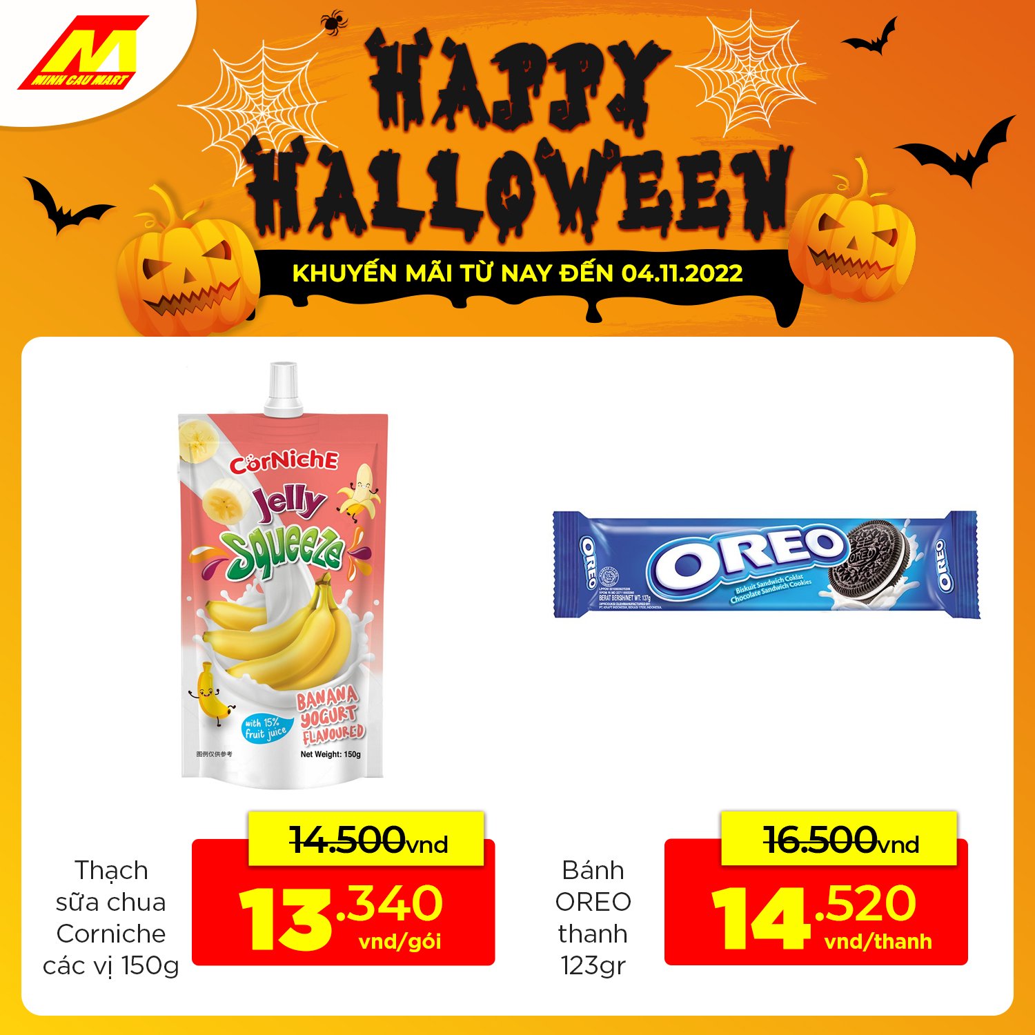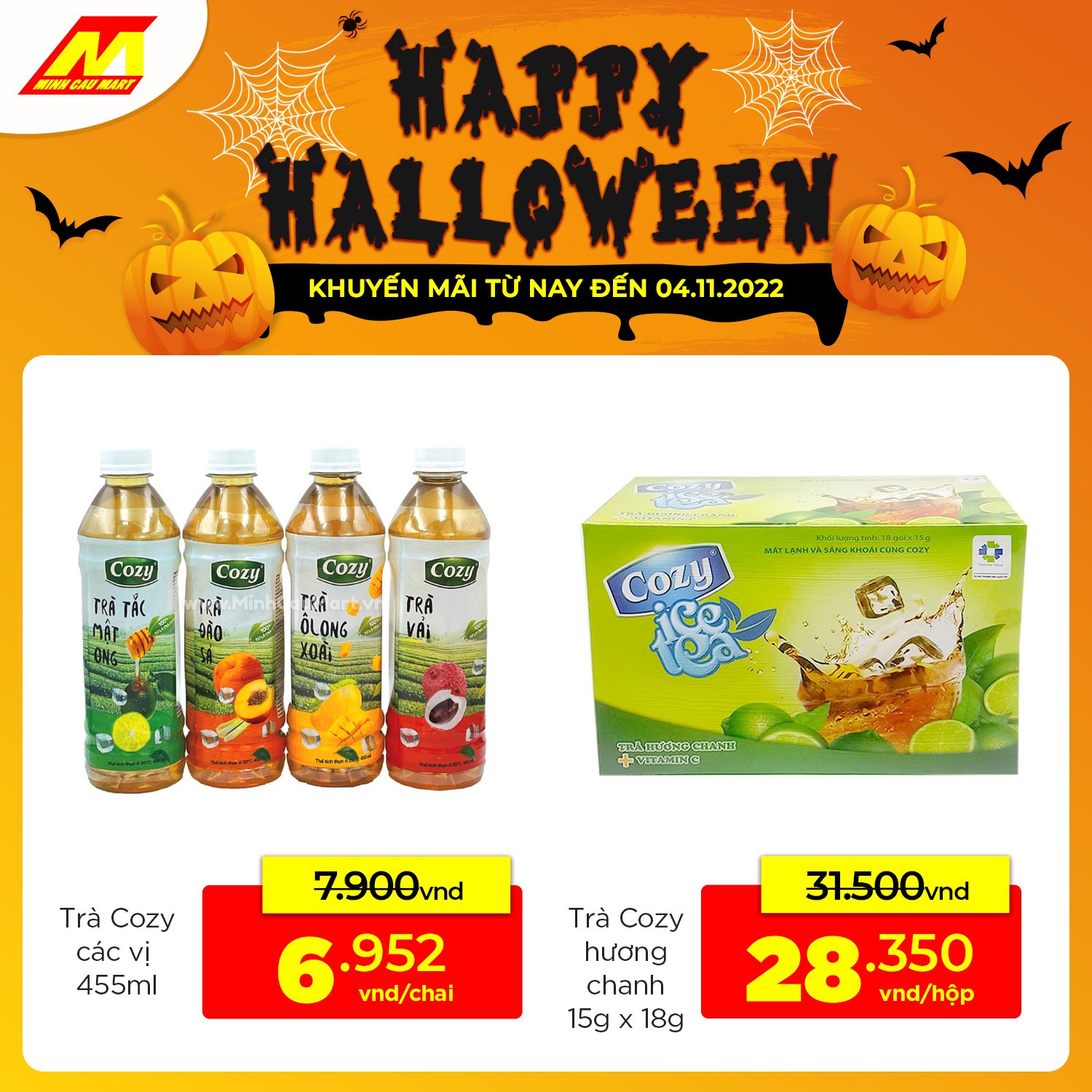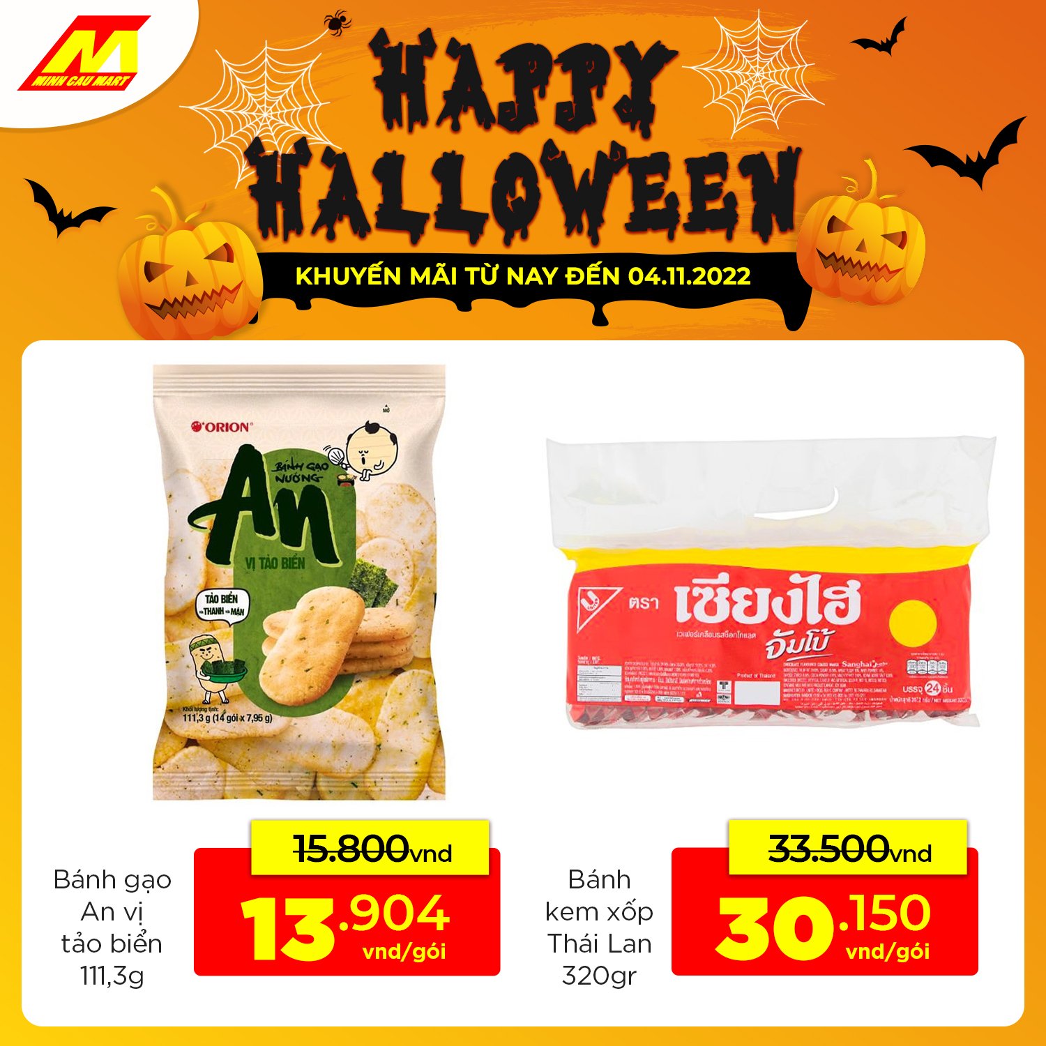 Lễ hội ma quái, săn DEAL bánh kẹo nước thoải mái >> Nhanh ghé Minh Cầu Mart gần nhất mua sắm hoặc đặt hàng online trên App/web để chuẩn bị bàn tiệc đêm thịnh soạn nào!!